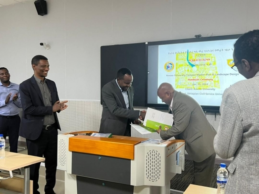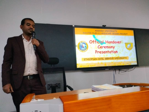 Ethiopian Civil Service University (ECSU) officially handed over the Assosa University Campus masterplan and landscape design project to Assosa University on January 15, 2024. Assosa University President Dr. Kemal Abdurahim has received the project design from Dr. Alemayehu Debebe, ECSU Vice President for Research and Partnership.